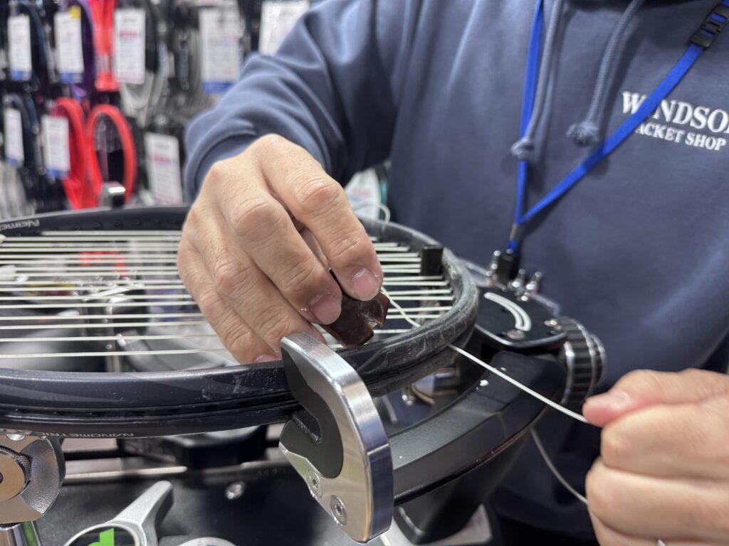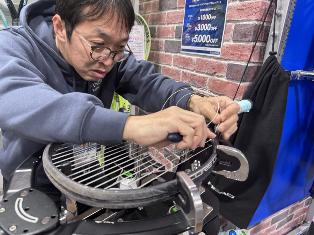 斉藤さん:よく言われます(笑)。お客さまからも「いつも端っこで張っていますね」と声をかけられるんですよ。本数で言うと、ウインザー全体ではおそらく世界で一番張っているのではないかという自負があります。お店には毎日毎日、本当に多くの依頼が来ますから。テニスもバドミントンも含めて、張り替えだけで毎日何十本と来ますし、新しくラケットを購入される方の分も合わせると、相当な数になりますよ。