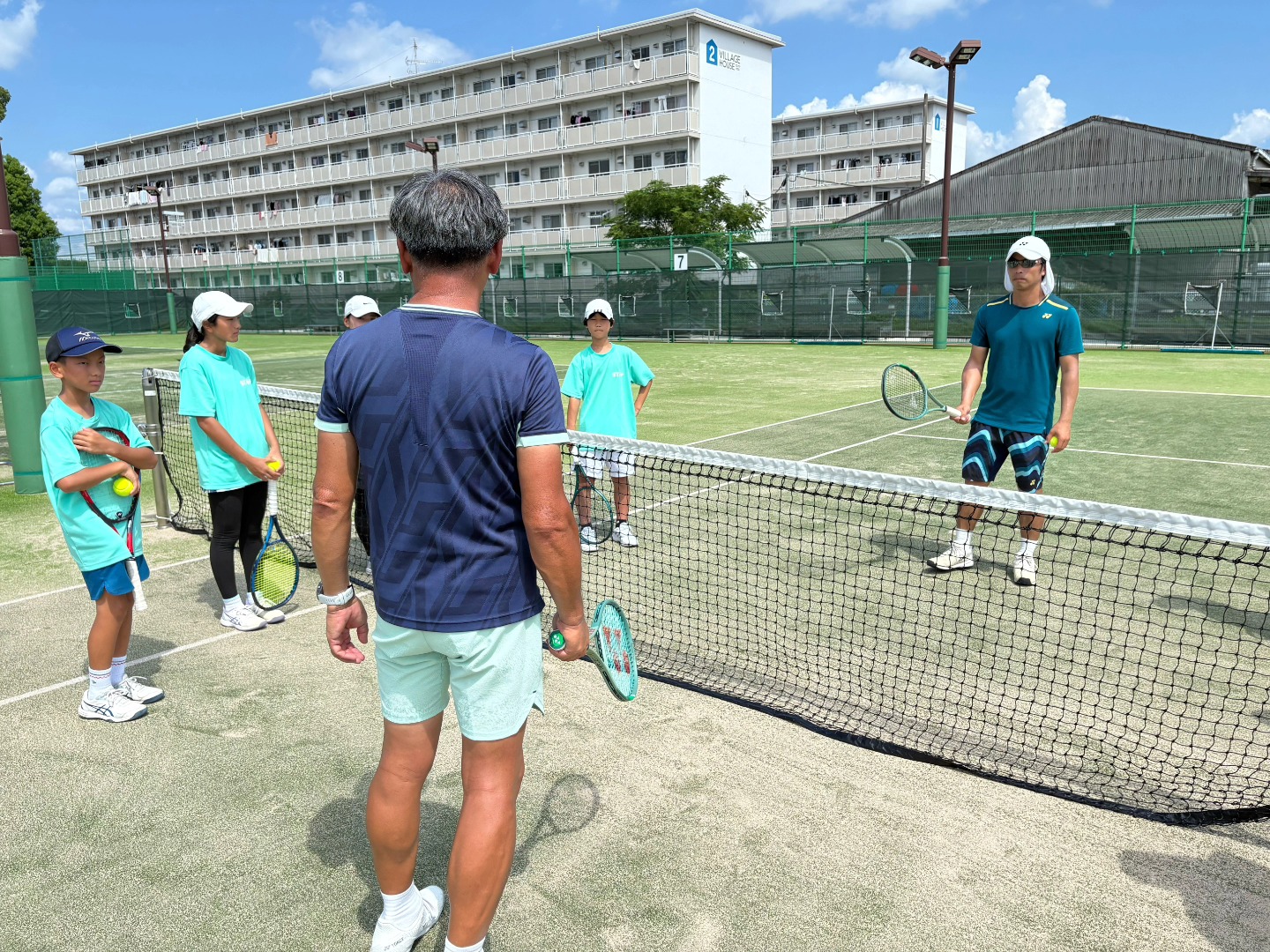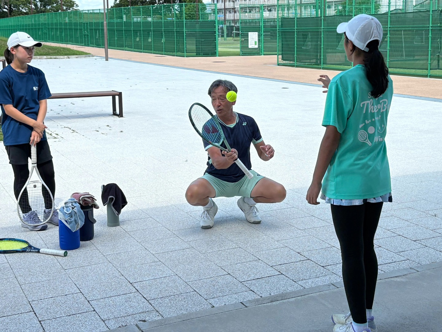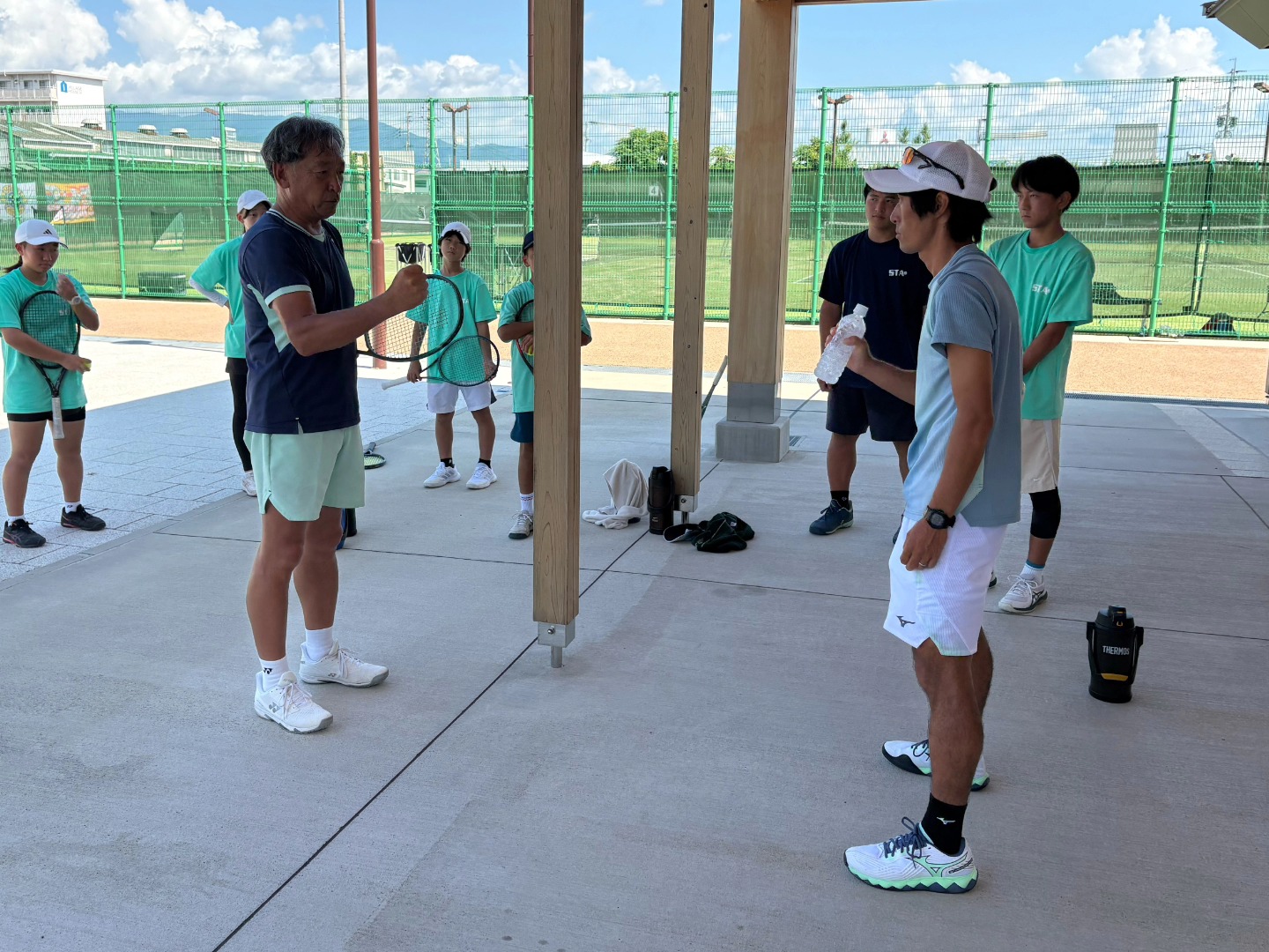 暑さの中でのスタート…フィジカルウォームアップ後は、日陰を探して、ボレーの基礎練習 調整と連鎖について説明し、その体得法を紹介しました💡