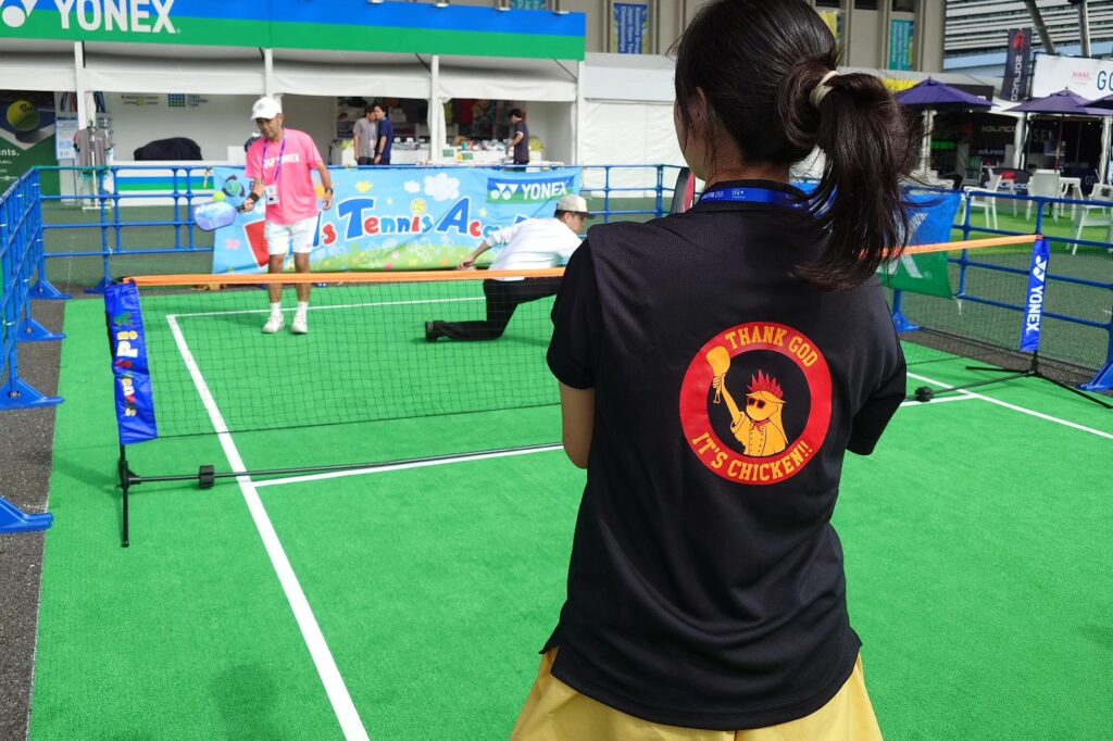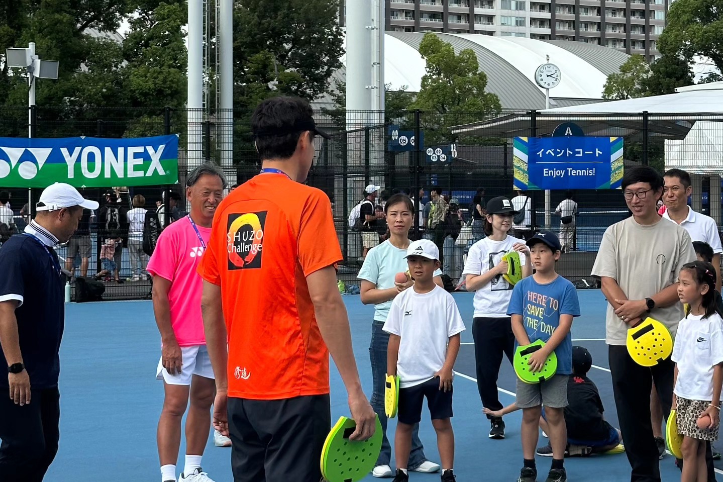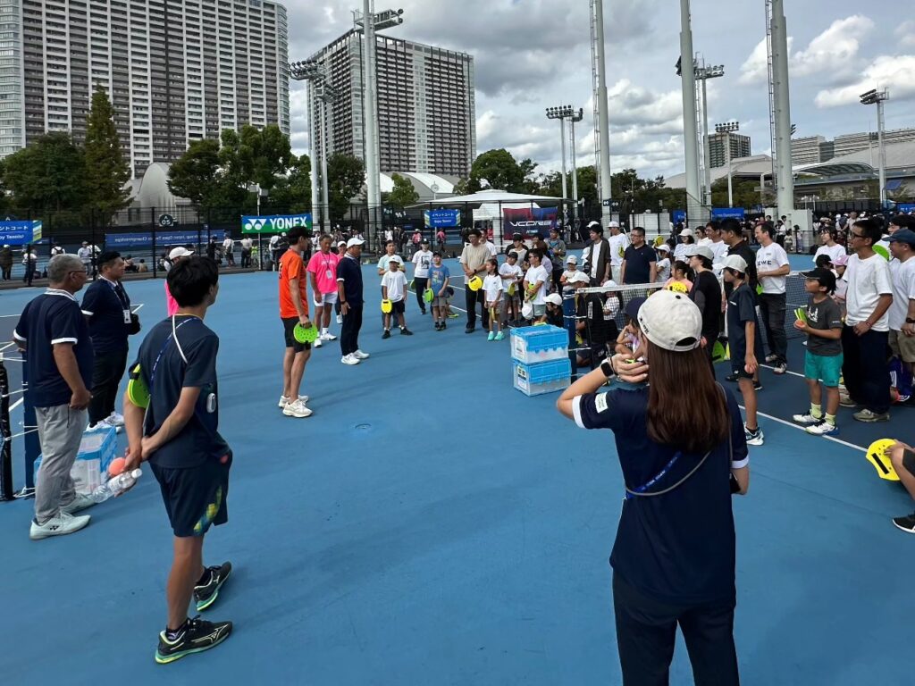 連日、コロシアム南広場 PLAY+STAY イベントコート 16 17番コート テニス体験コーナーを運営しております。