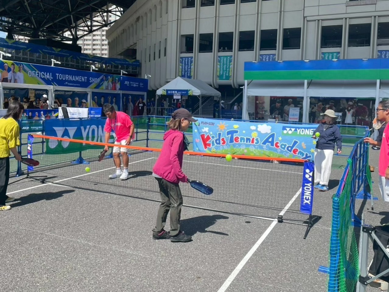 明日も、コロシアム南広場 PLAY+STAY イベントコート 16 17番コート テニス体験コーナーを運営しております。